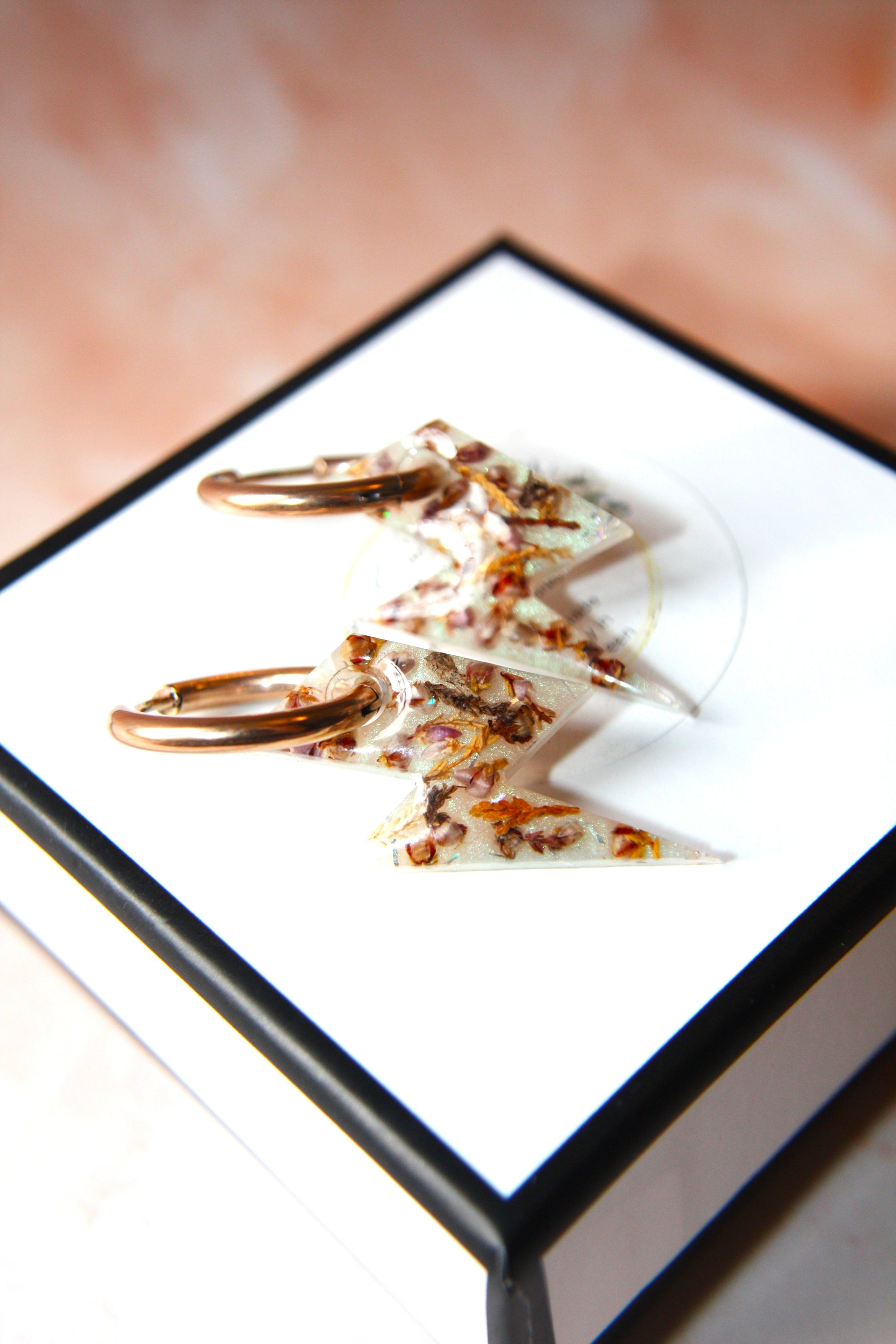 The lightning bolt design adds a striking geometric element, whilst the natural botanical confetti creates an organic, one-of-a-kind aesthetic.