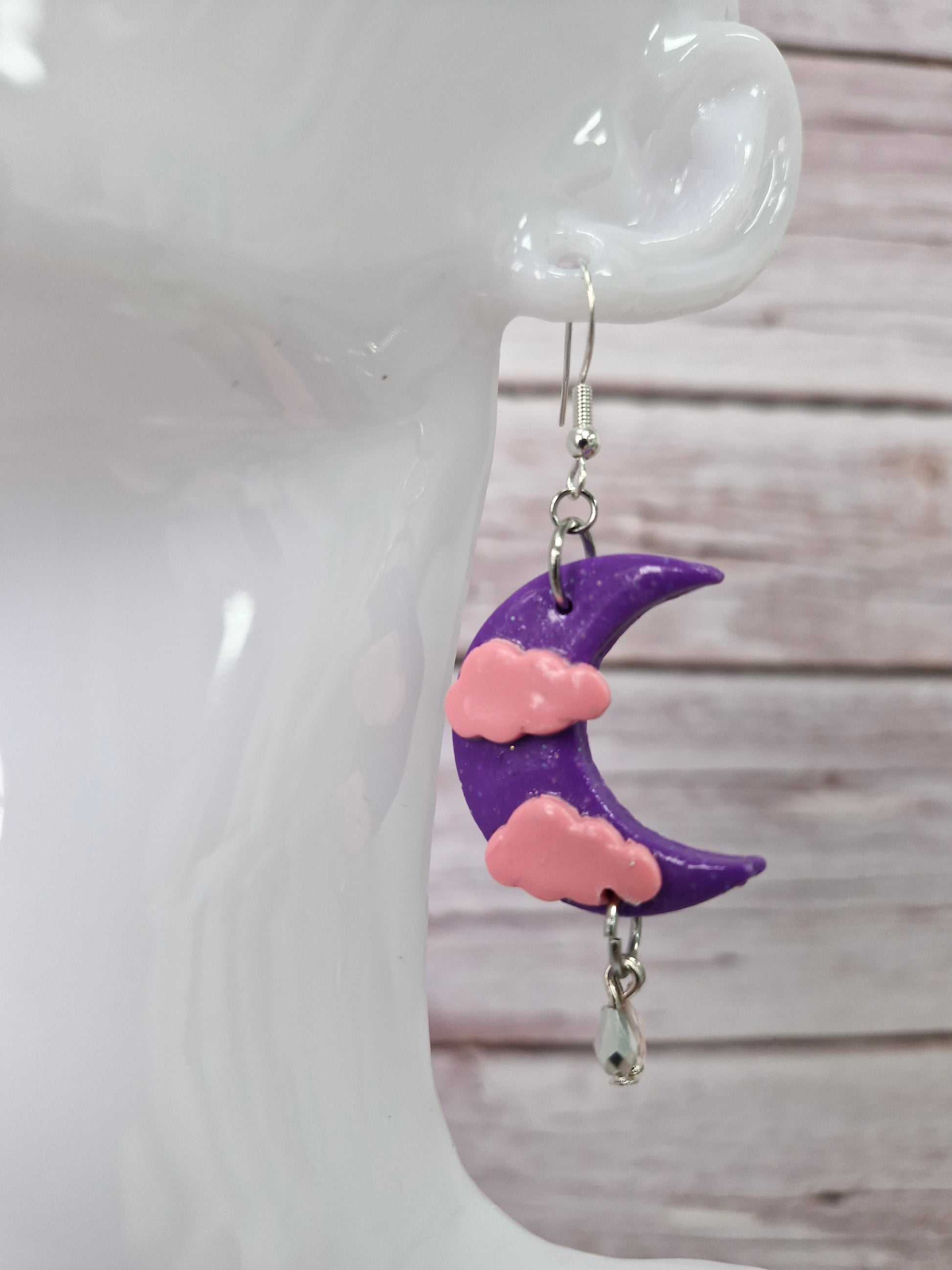 Blue Crescent Moon & Cloud Polymer Clay Dangle Earring