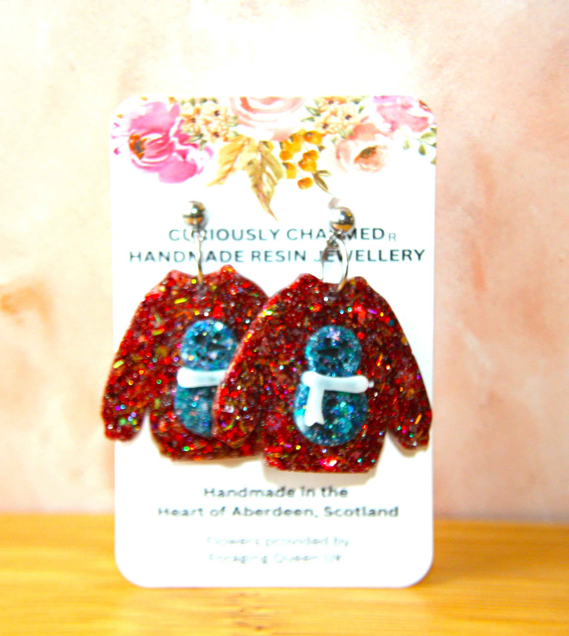 Bright Red Glitter Ugly Christmas Snowman Jumper Dangle Earrings