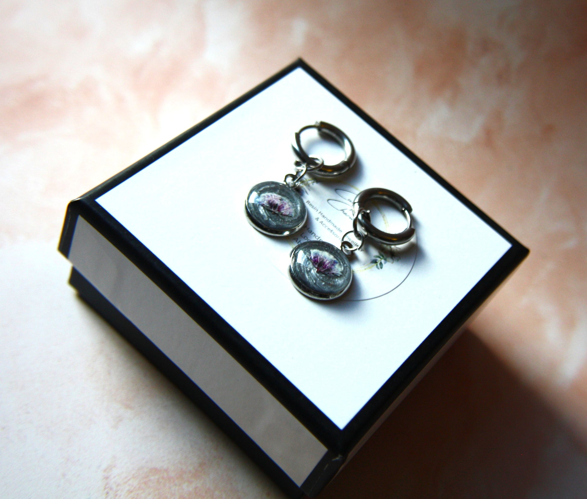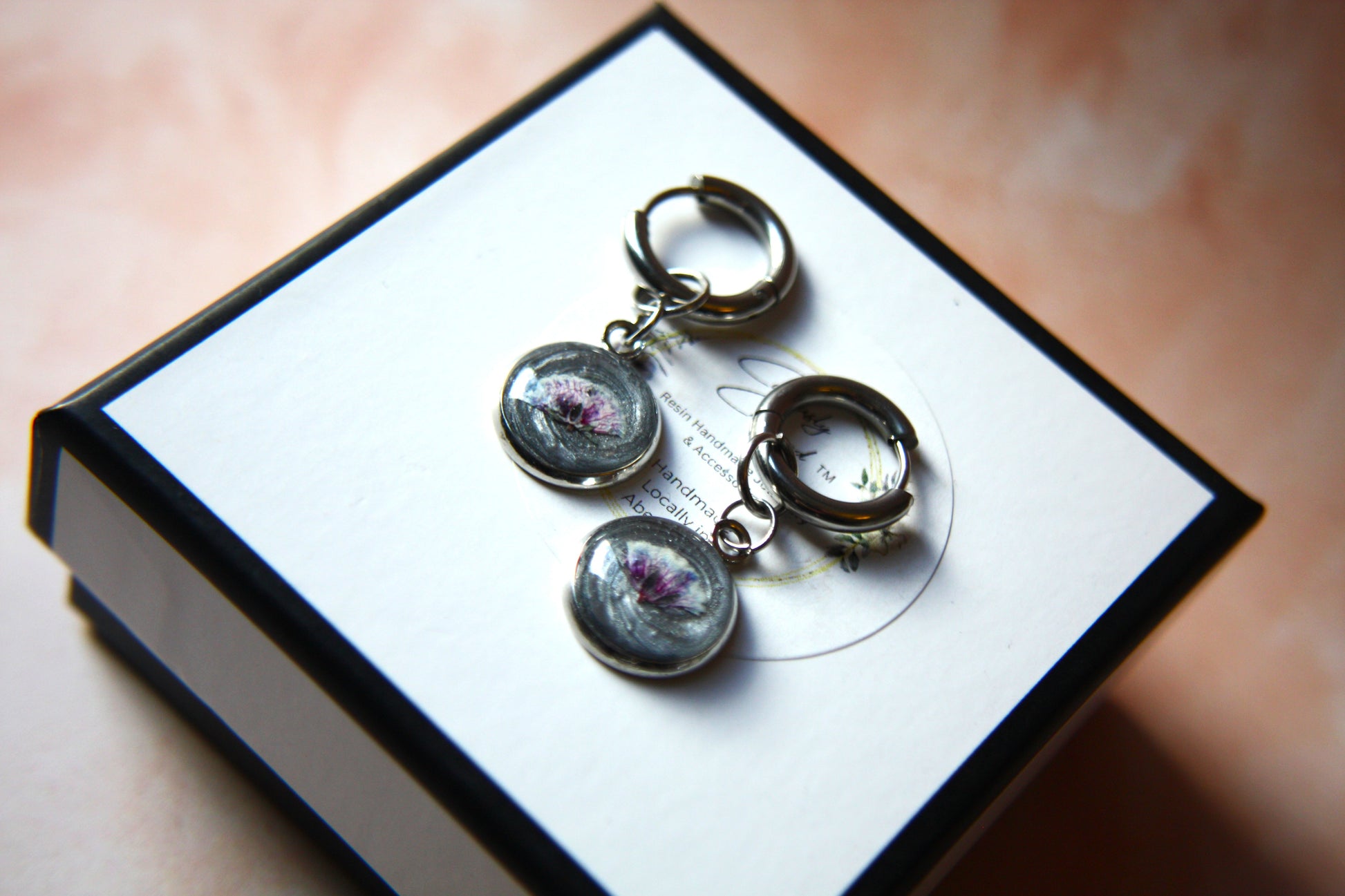Featuring genuine pressed baby's breath flowers positioned atop a subtle gray background with delicate Rhodium hoops, these earrings offer understated botanical elegance.