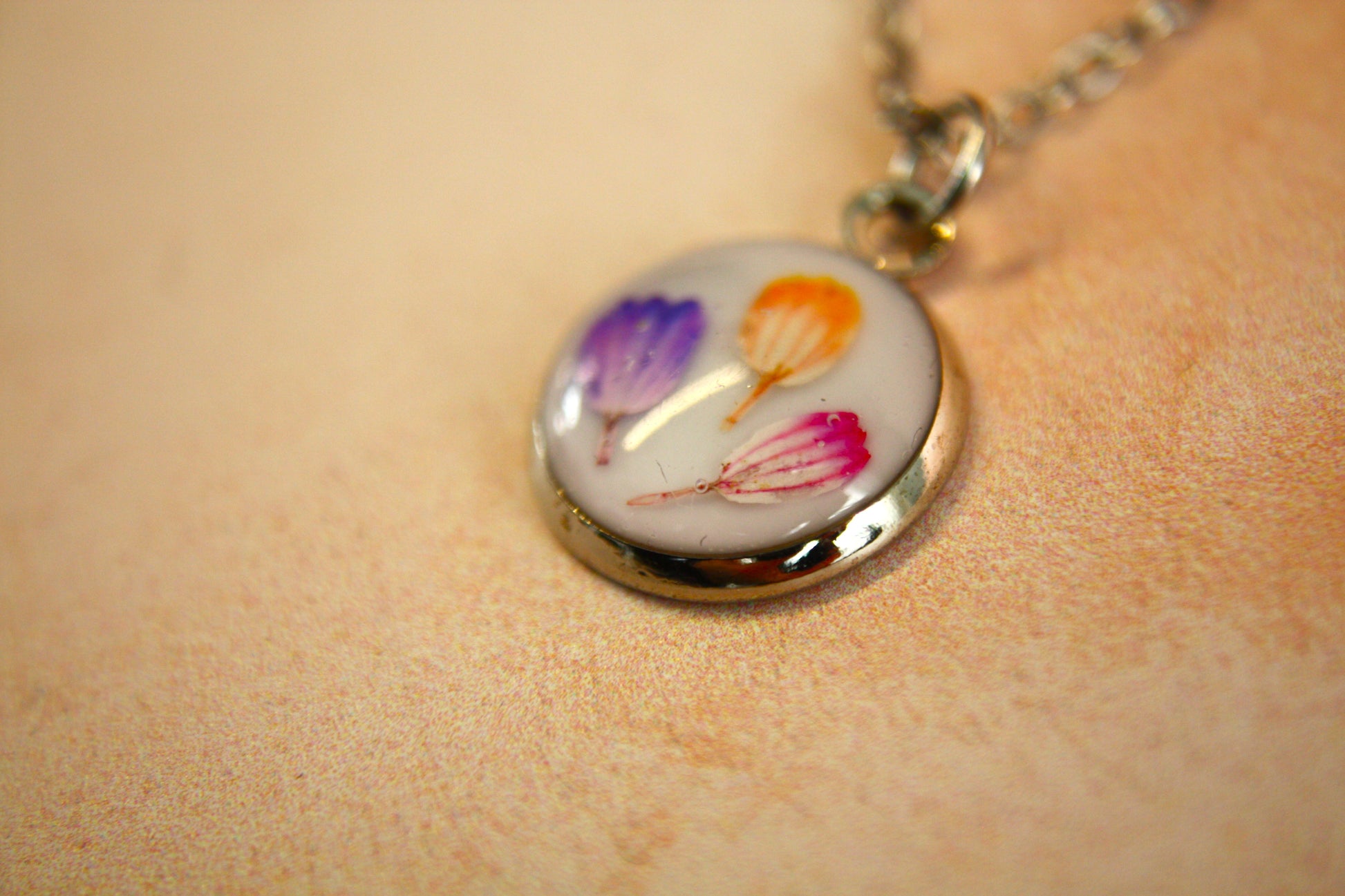 Delicate and distinctive, this miniature necklace showcases an authentic dried tulip petal suspended within a clear resin pendant.