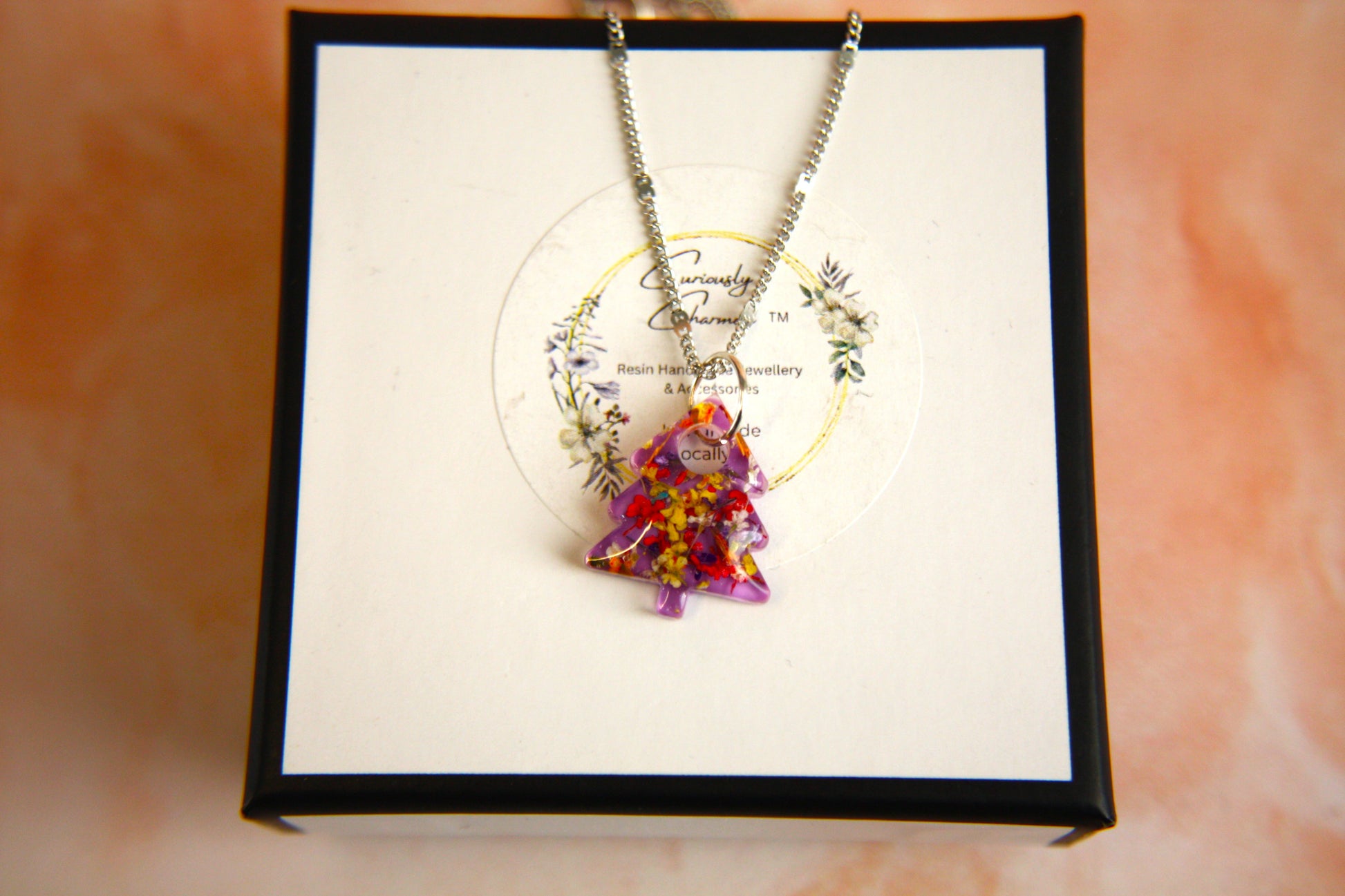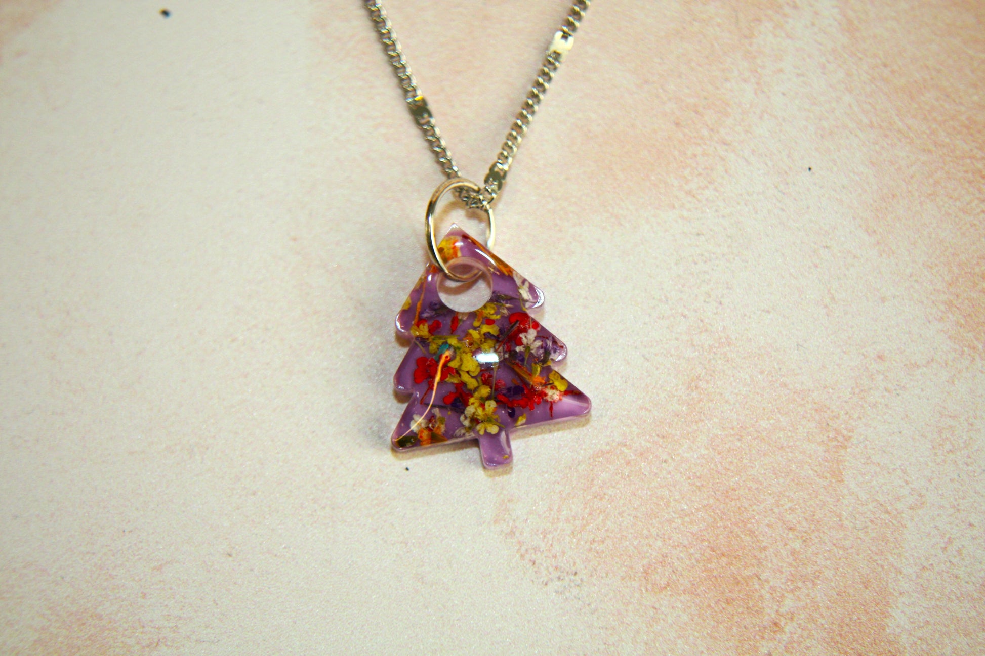 Small Christmas Tree Real Flower Queen Anne Petal Resin Necklace