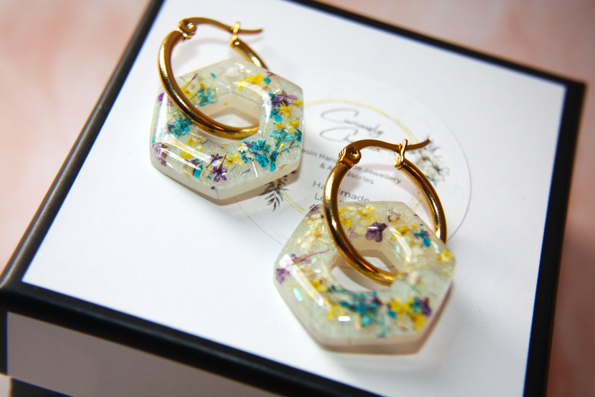 Delicate Queen Anne Lace specimens are encased within octagonal resin frames and suspended from elegant gold hoop earrings.