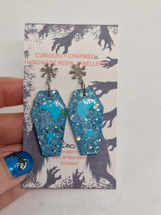 Blue Glitter Coffin and star dangle earrings